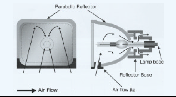 空冷キセノンショートアークランプの最大入力は10kWで、それ以上の入力を必要とする場合は、水冷式キセノンショートアークランプを用いる。水冷式では入力30kWが実用化されている。水冷を行うのは、ランプの外部ではなく、陰極と陽極の内部である。