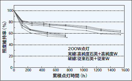 なお、このランプへの投入電力は、前述のようにコンデンサに類似した電圧-電流の位相がずれること、およびランプに印加される電圧が2,000V0-P程度であることから簡易な方法で測定することができない。このため電力としては点灯装置の入力電力で表記する。