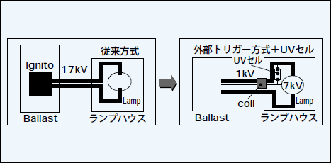 • a.ランプ端子間に高電圧を重畳し、絶縁破壊を発生させ、放電路を形成する。