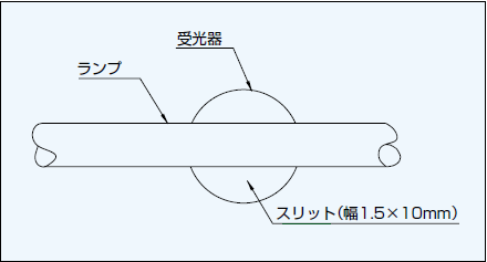 図4-72は照度分布特性の評価方法である。照度計の前面にランプ軸方向に対して垂直になるようスリット(1.5mmx10mm)を設け、ランプ軸方向に照度計を移動させることにより、ランプ軸方向の照度分布の評価を行う。