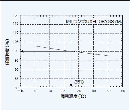 環境安定性とはランプ照度の周囲温度による影響を評価したものである。図4-74に0°C~50°Cまで周囲温度を変化させたとき外部電極式希ガス蛍光ランプの照度特性を示す。図.7より周囲温度が0~50°C変化したときの光量変化率は±3%であり、周囲温度の影響を受けにくいランプであることがわかる。