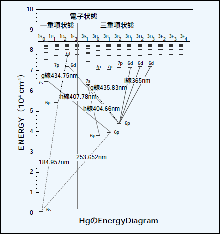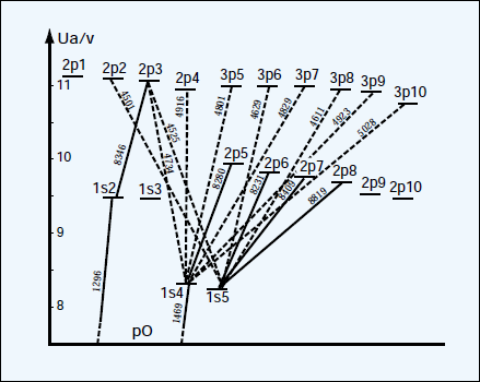 封入されているキセノンガスが光るのは、キセノンの原子あるいは分子の励起によって光が発生することによる。原子内の電子は普通の状態ではいずれの内核電子も、定常状態としては、それぞれの電子に規定されたただ一つの特定状態しか持ちえないという、フェルミ分布に従って最低準位の状態から順次席を占めている。最外殻電子も同時に取りうる準位のうち最低の準位に位置している。この状態を基底状態という。外部から光やX線があたったり、あるいは運動電子が衝突したりすると、内核電子は基底の状態よりも高いエネルギー準位に移ることができる。このような現象を励起と呼び、その状態を励起状態という。励起状態は非常に不安定で、短時間(約10-8秒)でもとの基底状態に戻る。しかし水銀や不活性ガスにおいては、これよりずっと長く10-2秒程度励起状態にとどまる場合がみられる。このような状態を準安定状態と呼ぶ。原子が励起状態から低いエネルギー状態にもどる時に、余ったエネルギーを光として放射する。このエネルギー差によって放射される光の波長が違う。言い替えると色が違ってくる。図4-1に代表的なキセノンのエネルギー準位を示す。