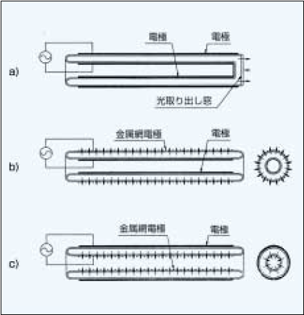 c)は円筒内部放射型のエキシマランプで、b)の構造で外側電極と内側電極を逆転させたものであり、内側管の内面方向に光を取り出す方式にしたものである。この方式のランプは、線状の処理物や流体等の処理に適している。