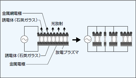 放電空間内の放電プラズマでは、各放電柱は互いに独立している。従い、放電柱を分割して図4-89の右図の様に描いても等価であり、これはエキシマランプを並列に点灯している状態に相当する。実際に、太いランプや細いランプなど、色々なランプを1つの電源で並列点灯することが可能である。