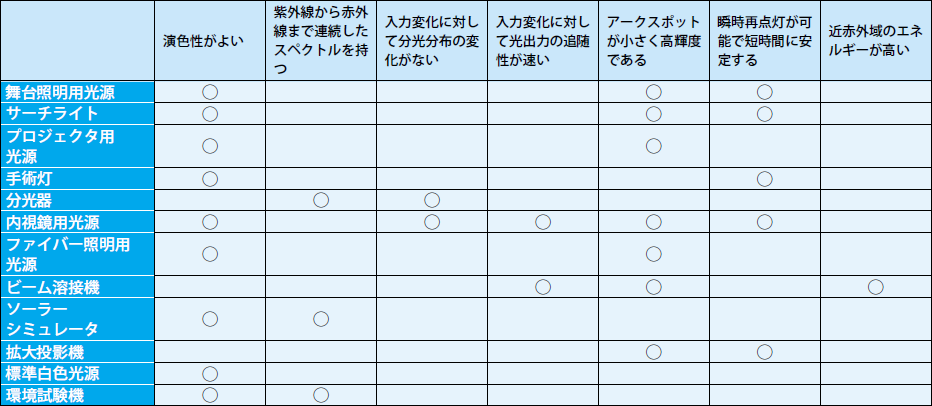 キセノンショートアークランプは上述した特長によって表4-2のような用途にまとめられ、重視される特長には◯印がつけられている。