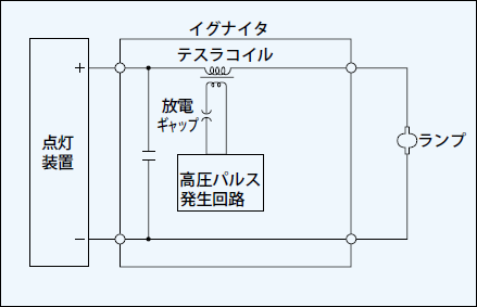 イグナイタの回路を、図4-10に示す。テスラコイルと呼ばれる特殊なパルストランスと放電ギャップを介してテスラコイルの1次側に高電圧パルスを供給するパルス発生部で構成される。放電ギャップを使用して高電圧パルスを発生し、これをテスラコイルの1次側に加え、テスラコイルでさらに昇圧し、昇圧した高電圧パルスをランプ電極間に重畳することにより、ランプ電極間を絶縁破壊する。(テスラコイルは、点灯装置とランプの間に配置される。)
