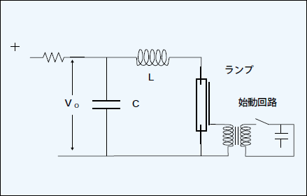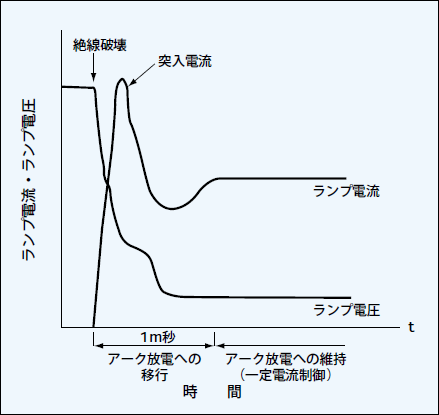 絶縁破壊が発生し、細い放電路が形成されたら、それをグロー放電を通ってアーク放電にスムーズに移行させなければならない。このために、点灯装置から突入電流が供給される。突入電流は、点灯装置内部の100V~200Vに充電されたコンデンサに蓄えられた電荷を一気に放出することにより発生させている。