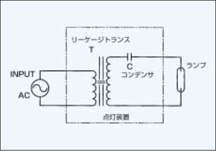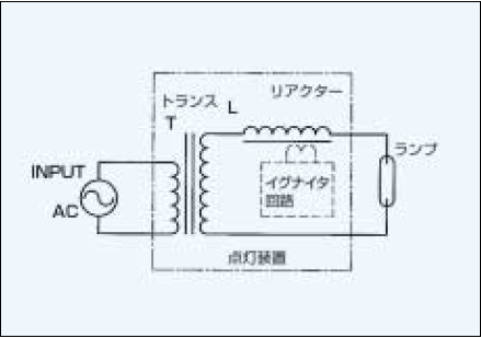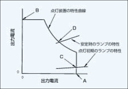 アーク放電に移行すると、ランプ電圧は急激に下がる。安定なアーク放電に移行する過程において、ランプ電流が増えるとランプ電圧が下がる、負特性と称される領域がそれである。点灯装置は、ランプ電流を限流することにより、放電を安定に維持させる役割を果たす。