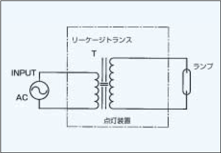 ランプを点灯させるには点灯装置が必要である。点灯装置とは、ランプの始動(絶縁破壊)、アーク放電への移行、アーク放電の維持を行うためのものである。点灯装置は、点灯装置本体(ランプ電流を制御する部分)と、イグナイタ(ランプの始動を行う部分)の2つの部分に分けることができる。図4-9に示すような配置でランプを点灯する。点灯装置とイグナイタは、キセノンショートアークランプを、下記の過程で点灯させる。