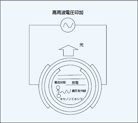 1個の準安定原子と2個の基底原子の3体衝突によりエキシマは生成されるが、希ガス分子の基底状態は不安定で、すぐに2個の基底原子に解離する。このとき172nmのエキシマ放射が生じる。一般的に、ガス圧を高くすることにより172nmの放射強度は増加するが、不点灯、ちらつき等の問題が発生する。