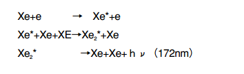 図4-70からわかるようにスペクトルはキセノンの共鳴線である147nmのピーク強度は無く、キセノンエキシマから放射される172nmの1つのピークからなることがわかる。外部電極式希ガス蛍光ランプではキセノンの封入ガス圧が高いために、蛍光体を励起する真空紫外線はキセノンの147nm共鳴線より、エキシマから放射される172nmの真空紫外線が支配的である。以下に3体衝突によるエキシマ生成過程と真空紫外線の放射過程を示す。
