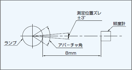 外部電極式希ガス蛍光ランプの光学特性について説明をする。外部電極式希ガス蛍光ランプの光学特性の評価項目は、照度特性、照度分布特性、分光特性等であり、以下に各特性の評価方法を示す。図4-71は照度特性の評価方法である。照度計はミノルタ製照度計(T-1M)を使用し、ランプ管表面と照度計の距離は8mm、角度は±3°である。通常、照度特性はランプを点灯させ、照度が安定した3分後の照度計の値を評価する。