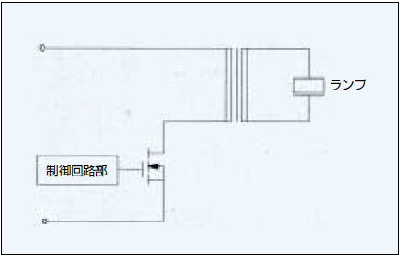 次に急峻な立ち上がり、立ち下がりを有する波形を実現する方式としては、フライバック方式を利用したものがある。このランプの特徴は、電圧変化に応じてランプに電流が流れる。その電圧時間変化率が大きいほど電流のピーク値が高くなり、照度が高くなる。しかしながら、電圧時間変化率が大きい、電流のピーク値が高いということは、スイッチ素子として使用する部品の効率やEMIの点から、回路としては好ましくない面がある。したがって、ランプの発光効率と点灯回路の電力効率の最適化を図る必要がある。この回路方式は、回路の制約上、30W程度の電力までである。この方式で実現できる照度は、イエローグリーンタイプで70,000 lx、ホワイトタイプで35,000 lx程度である。