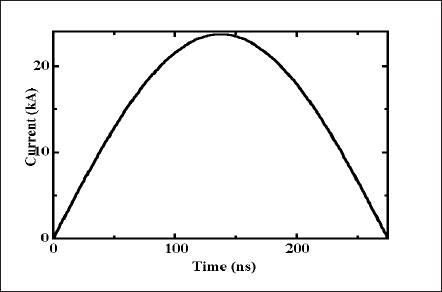 The model solves the time-dependent transport equations of mass, momentum and energy for a compressible fluid. Azimuthal magnetic field compresses the plasma towards the plasma axis and causes the Z-pinch. Curl of Ampere’s law, which is a derivation of Maxwell’s equations, is solved to get the magnetic field. The current density distribution in the plasma is obtained by solving the Laplace’s equation. Solution of current density (J) and magnetic field (B) paves the way to include the Lorentz forces or the JxB terms in the momentum equations. The radiation term in the energy balance equation is introduced using P-1 radiation model [2]. A vendor-supplied CFD (computational fluid dynamics) package, Fluent, is used as the computing platform, where all equations have been solved through customized routines. Figures 1 and 2 illustrate the axi-symmetric geometry and the current profile respectively. A time step of 1 ns has been chosen in the calculations.