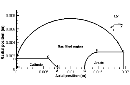 The 2-D schematics of the lamp geometry that is used for illustration purpose of the developed model are shown in Fig. 1. Tangential geometry along z coordinate of the 3-D system is just the replica of the radial geometry in y coordinate. The glass bulb is ellipsoid and the interelectrode gap is 5 mm. Developed calculating scheme is based on separate modeling of anode, cathode, plasma, glass bulb, and stems. Consistent result at the boundaries of sections is obtained through a back and forth iteration scheme. This domain-to-domain iterative scheme has been chosen for the implementation suitability in Fluent (version 6.1) package. As was mentioned above, discussed results of this paper are for the plasma and electrodes only. Boundary conditions and applied calculation techniques for cathode, anode and plasma sections are outlined below.