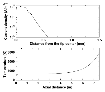 Solution of cathode model produces the current density and temperature distributions at the cathode/plasma interfaces. Fig. 2 shows such distributions. Note that these distributions are obtained from the final step of the cathode-plasma-cathode iterative scheme. It can be seen that current carrying region extends beyond the tip (AB) and spreads over the taper region (BC). These distributions are used as boundary values in solving the plasma model.