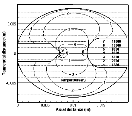 Fig. 4 shows the isotherms of the discharge domain in the z―x plane (at y=0) of the 3-D geometry. Temperature contours clearly show that the plasma is not in axisymmetric situation, especially at the colder region of the domain. Temperature at the upper region of the lamp is higher than that of the lower region, especially around the electrodes’ends (viz. contour number 1). Due to buoyancy, hot gases flow upward. Temperature near the cathode tip is the maximum and it is above 11 000 K. Near the anode tip, temperature rises above 10 000 K. Between the electrodes, what is also known as the plasma column, the gas temperature rises to an intermediate level of about 8000 K. It can be realized that stiff temperature gradient exists just in front of the electrode tips and it is significantly stronger at the cathode end. Likewise, all other plasma properties also have very high gradient near electrodes’ tips, making the regions nonequilibrium locally. The nonequilibrium effect is, however, stronger at the cathode end.