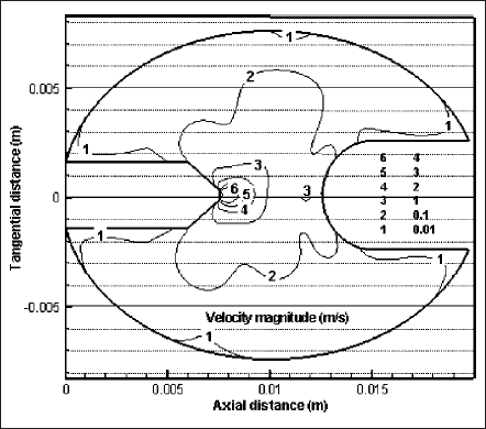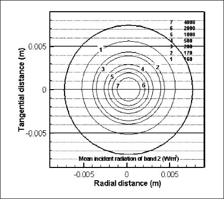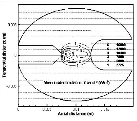 The isocontours for mean incident radiation of band 2 (119-680 nm) are shown in Figs. 8 and 9. Fig. 8 shows the contours at y = 0 of z―x plane of the domain whereas Fig. 9 is drawn at x = 11mm of y―z plane. Like temperature and velocity, incident radiation has the maximum near the cathode surface. Contours 1-4 of both figures present the deviation from axisymmetry for horizontal lamp operation. Discharge region at the bottom and electrodes’ end of the lamp does not absorb radiation and, therefore, cold but at the top, radiation is absorbed to make the region relatively hotter.