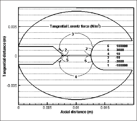 Figs. 6 and 7 depict the tangential components of the Lorentz force and the force due to stress tensor. These profiles are drawn to estimate the significance of Lorentz forces in momentum equations. It is indeed true that electromagnetic interactions are small if the current magnitude is small. But even for a small current, local value of Lorentz force may be comparable with other force components of momentum equation. This may happen if the current concentrates over a small region on cathode and anode. Spot mode operation of electrode, especially cathode, is a good example for such situation. For a direct comparison, magnitude of contours in both figures is kept the same. In Fig. 6, contours beneath the contour numbers 2 and 5 at the cathode end are for the magnitudes of -105 N/m3 and 105 N/m3, respectively. Comparing these contour values with the forces due to stress tensor of Fig. 7, we can say that Lorentz forces are very strong and influential in some spatial positions. The presence of these strong Lorentz forces near the cathode surface elucidates that these forces have strong impact in causing high plasma velocity near cathode tip. Change of plasma velocity affects all other plasma properties. Therefore, Lorentz forces are significant factors in controlling plasma behavior and as a whole, lamp performance. Any discharge model that solves momentum equations would benefit if it accounts for the effects due to electromagnetic interactions (or Lorentz forces).