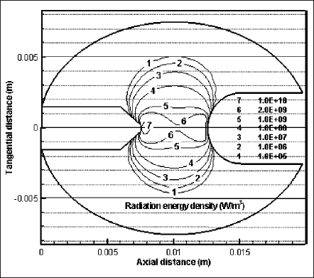 Figs. 10 and 11 present the distributions for the rate of change of volumetric Joule (or input in discharge) and radiation energies. Both energy densities are the maximum near the cathode surface. Current intensity effect on generation of radiation energy is shown in Fig.12. It presents the ratio of total radiation power to the Joule power of the plasma. Note that this Joule power is less than the total input power of the lamp because it excludes the powers expended in the near electrode regions or the sheaths. For the case of 20 A, the Joule power is calculated as 234 W whereas the radiation power is 87 W; the ratio of radiation to Joule power is 37%. The ratio increases to 45% when the lamp current is doubled. Increased current density due to the higher lamp current intensifies the volumetric Joule energy of plasma. This, in turn, raises the plasma temperature. As a consequence, the plasma becomes more conducting, the current-carrying region as well as the effective discharge region, expands. As a result, the overall radiation pronounces with current.