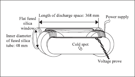 The temperature of a small ‘cold spot’ appendage was controlled the rmoelectrically to stabilize the Hg pressure at the wall. The entire lamp was enclosed in a temperature- stabilized oven to ensure that the appendage served as the cold spot. This oven was constantly flushed with dry nitrogen so that radiation at wavelengths λ < 200 nm was not absorbed by the oxygen in the laboratory air. This nitrogen flushing had an additional benefit in that it limited ozone production by the lamp.