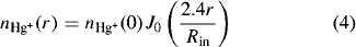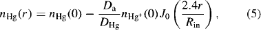 where J0 is a zero order Bessel function Rin is the inner radius of the discharge tube. This simple solution clarifies the essential physics: specifically the radial cataphoresis is significant any time the fractional ionization of Hg is comparable with DHg/Da or Tg/Te•. If the fractional ionization of Hg actually approaches DHg/Da, then the higher order diffusion modes become important in both the ambipolar transport of electron-ion pairs and in the return diffusion of Hg atoms. This occurs because the ionization rate per unit volume cannot mimic the J0 radial distribution of electrons once the density of Hg atoms is depleted on axis. At some point with severe radial cataphoresis the buffer gas starts to become excited and ionized, because nHg (r)cannot become negative. Severe radial cataphoresis with electrodeless operation often extinguishes the discharge since it disrupts the RF circuit match. However, a robust high power RF source can be used to change the colour of a Hg-Ne discharge as demonstrated by Bakker et al (2000).