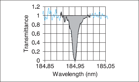 This standard approach for processing the HSAS data worked well for the Hg+ 194 nm line, but it had to be modified for the Hg 185 nm line. The column density of Hg atoms remained large even when the discharge in the experimental lamp was extinguished. It was quite difficult and time consuming to remove enough Hg from the path to make the lamp transparent at 185 nm by cooling the lamp. The dark-signal-corrected continuum spectra for normalizing pixel-to-pixel variations in the CCD and other effects were recorded by tuning the spectrometer to 186 nm. This resulted in less than perfect cancellation of pixel-to-pixel variations and ‘fringes’ from interference of radiation in optical components. The absorption signals at 185 nm were so large that this additional noise in the data was not a serious problem.