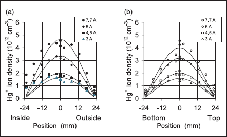 Figures 5(a) and (b) are, respectively, plots of the Hg+ density as a function of the offset from the axis in the horizontal (a) and vertical (b) planes at discharge rms currents of 3, 4.5, 6, and 7.7 A with a 323 K (50ºC) cold spot temperature. The ordinate of the plots is given as an absolute density or (columndensity)/(length of plasma). The plasma length of 320 mm has not been corrected for fringing of the plasma near the bends at each end. A least-square fit to a zero order Bessel function is superposed on each plot. Some slight asymmetry due to the discharge‘hugging’the inner wall of the toroidal discharge tube is visible in some of the plots.