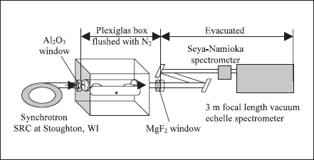 In earlier experiments with the HSAS facility, and in the research described here, absorption spectra were processed using a digital subtraction technique described by Wamsley et al (1993). In order to remove the contribution of the experimental lamp emission from the absorption spectra, the CCD was used to record an emission spectrum from the experimental lamp with the synchrotron beam blocked, which was then subtracted pixel-by-pixel from an absorption spectrum recorded with the synchrotron beam unblocked. The absorption spectrum, with experimental lamp emission removed, was normalized (divided) pixel-by-pixel using a dark-signal-corrected continuum spectrum recorded with the experimental lamp turned off. This digital subtraction and normalization of spectra corrects for experimental lamp emission and for pixel-to-pixel variations in the CCD sensitivity and dark signal. The method also removes fringes from optical components and other non-random noise. Good signal-to-noise (S/N) ratios have been achieved using this method at wavelengths down to 140 nm (Fedchak et al 2000).