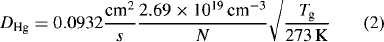 where DHg is the diffusion coefficient of Hg atoms through the Ar buffer gas, N is the buffer gas density, nHg is the density of Hg atoms, Da is the ambipolar diffusion coefficient and nHg+ is the density of Hg+ ions. The first term of this equation is written in a fashion that clarifies that some of the reduction in the central density of Hg atoms was due to gas heating. This effect was neglected in the initial analysis of absorption data from our experiment, but was included in the more detailed modelling described in the companion paper (Lister et al 2004). A cold spot temperature of 323 K was maintained for most of the experimental results reported herein. A constant discharge gas temperature Tg=350 K and a constant electron temperature Te=11 600 K were used in the initial analysis of this data. For consistency with the companion paper, the coefficient for Hg atoms diffusing through Ar was taken from Lister and Coe (1993); this coefficient was originally computed by Cayless (1961) using the methods of Hirschfelder et al (1954). The ion mobility in the ambipolar diffusion coefficient was taken from Chanin and Biondi (1957). The coefficients are