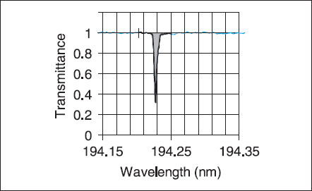 Figure 4. Four Sample Hg+ absorption spectrum at 194 nm. This spectrum was recorded along the axis of the custom lamp with an ID of 48 mm, 300 mTorr of Ar, 6.0 A of RF current at 250 kHz and a cold spot temperature of 323 K.