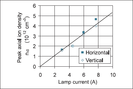 Figures 5(a) and (b) are, respectively, plots of the Hg+ density as a function of the offset from the axis in the horizontal (a) and vertical (b) planes at discharge rms currents of 3, 4.5, 6, and 7.7 A with a 323 K (50ºC) cold spot temperature. The ordinate of the plots is given as an absolute density or (columndensity)/(length of plasma). The plasma length of 320 mm has not been corrected for fringing of the plasma near the bends at each end. A least-square fit to a zero order Bessel function is superposed on each plot. Some slight asymmetry due to the discharge‘hugging’the inner wall of the toroidal discharge tube is visible in some of the plots.