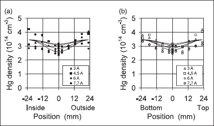 Figures 7(a ) and (b ) are, respectively, plots of the Hg density as a function of offset from the axis in the horizontal (a ) and vertical (b ) planes at discharge rms currents of 3, 4.5, 6, and 7.7 A with a 323 K (50ºC) cold spot temperature. The Hg column densities were converted to absolute densities using the 368 mm length between the inner surfaces of the Suprasil windows. The theoretical Hg densities indicated by the curved lines in the plots are from equation (5), the first order analysis of radial cataphoresis. It is important to note that there are no adjustable parameters in the theoretical plots, since the axial Hg+ densities, nHg+ (0), used in equation (5) are experimental and the Hg wall density, nHg(Rin), is from the cold spot temperature. All the experimental results show evidence of a ‘hollow’ Hgdensity profile, and all are in reasonable agreement with the model.