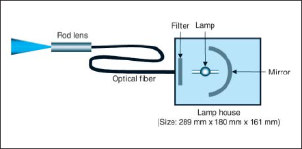 ファイバ型ランプ光源装置はウシオ電機社製SUS66 (電気入力:150W)を用いた。ファイバ型ランプ光 源装置の模式図をFig.2に示す。本装置は、光源本体 部とファイバ部とから構成されている。本体部でラ ンプから出た光は、SiO2-TiO2混合多層膜をコーティ ングした楕円ミラー(有効焦点距離:75mm,倍率:8倍)によって集光されファイバ内に導入される。その際、ファイバの入射口前面にバンドパスフィルタ(405±10nm)と熱線カットフィルタとが設置され、不要な波長の光は除去される。ファイバはプラスチック系ファイバで、直径は約10mmである。さらに、照射光の均一化のために、ファイバの照射口にロッド・レンズが設置されている。本光源装置のサイズは、ファイバ部を除いて、289mm×180mm×161mmである。実験では、この光源装置に2.1で作製したランプを設置して用いた。それらのファイバ型ランプ光源装置を、以後、Hg光源装置、Ga光源装置、K光源装置およびRb光源装置と略す。また、キセノンランプ光源装置はZEISS社製 Superlux(電気入力:300W)を用いた。