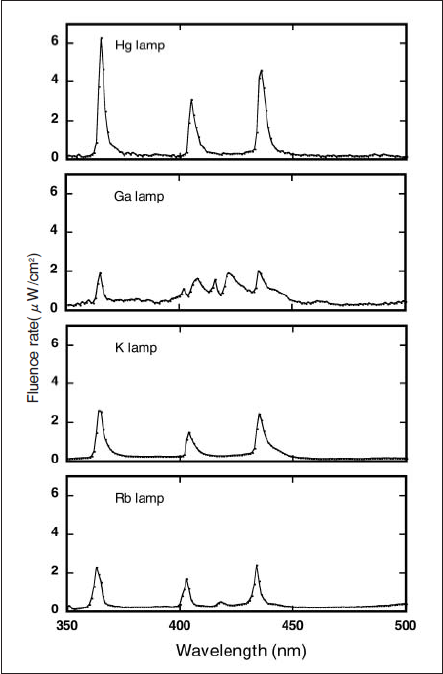 各ランプ単体の放射スペクトルをFig.3に示す。400nm以上の波長領域に注目すると、Hgランプでは405および436nmにピークが認められた。さらに、Gaランプは、402、408、416、422および435nmに5つのピークを示した。また、KランプおよびRbランプの放射スペクトルは、水銀の放射スペクトルに類似しており、いずれも404および435nmにピークを示した。また、各ランプ単体の波長領域405±10nmにおける放射照度をFig.3から算出した結果をTable 1に示す。ランプ単体の放射照度はRbランプ<Kランプ<Hgラン プ<Gaランプであった。