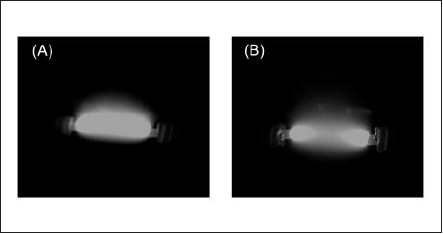 Table 1で示した各ランプ単体における放射照度と、Table 2に示したファイバ型ランプ光源装置における放射照度とを比較すると、ランプ単体におけるGaランプの放射照度はHgランプのそれより高いものの、Ga光源装置の放射照度はHg光源装置より低いことが明らかとなった。これはFig.5に示すとおり、Hgランプでは電極間でのアーク放電部が均一(Fig.5 (A))であるのに対し、Gaランプでは両電極付近に輝点が分散(Fig.5 (B))しているため、効率良く集光できなかったためと考えられる。