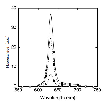 Fig.6 Fluorescence spectra of photoexited PpIX. ●: Hg lamp light source, ■: Ga lamp light source, ▲: K lamp light source, and ○: Rb lamp light source