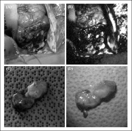 Fig.7 Photographs of malignant brain tumor tissues underwhite light (A and C) and under light emitted from Hg lamp light source (B and D)