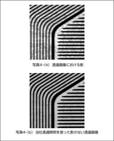 例えば、TABを普通の透過照明を用いて撮影すると写真4-(a)のように影が現れる。この影が配線に接したとき、画像処理上この影を“突起”として捉えてしまうことがある。これに対して当社の開発した特殊光源を用いることにより、写真4-(b)のような影の映り込まない画像を撮影させることに成功した。