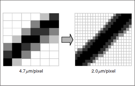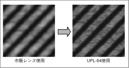 ファインパターン、言い換えれば「細い配線」を検査するためにはそれだけ高い分解能が必要である。当社の従来の検査機は市販品のマクロレンズを用いており、撮影した画像の分解能は4.7µm/pixel程度であった。これに対して前述した新規開発レンズUPL-64はx3.5倍レンズであり、分解能が2.0µm/pixelに向上した(図1)。