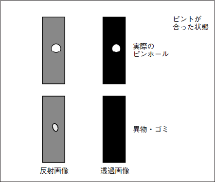図2 ピンホール/異物の透過画像と反射画像の見え方の比較