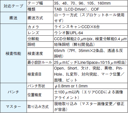 当社は1986年よりTAB露光装置を市場に送り出しており、現在はトップメーカーとしてTAB製造メーカー様に装置を提供させて頂いている。露光装置メーカーとして培ったレンズ・照明・ソフト・薄物テープ搬送についての技術を基盤として、検査分野への開発を進めた。