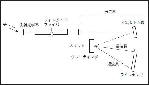 まず光はライトガイドファイバの先端にある受光部から分光器のスリットに導かれる。このファイバは光学繊維束で構成され、短波長域まで透過性の優れた石英ガラス製を使用する。分光器ユニット中のグレーティングは、スリットを通した光を分光しラインセンサ上に導く光学部品である。ラインセンサは入射した光の強さに比例した電気信号を出力する素子が1024個並んでおり一度に全ての波長に対する信号が得られる。