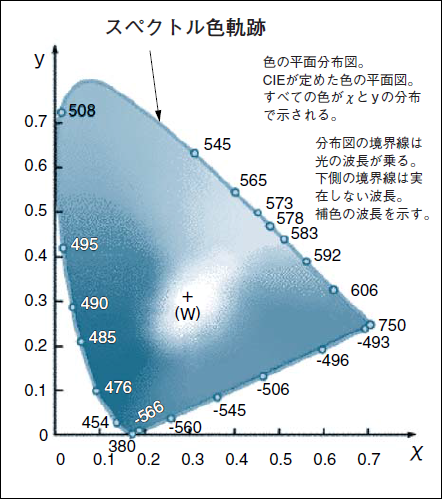 色度図の特徴は、縦軸yに緑成分を取り、横軸xに赤色成分を取ることである。光の三原色の残りの青はz成分となるが、この平面図には組み入れられていない。しかし、x+y+z=1という了解があるのでx成分とy成分が求まればz成分は自然に求まる。白はx0.33、y0.33の位置にあり、zも0.33となるため三原色がバランスよく配分されたものが白色であることが理解できる。