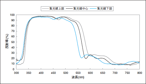 多層膜蒸着による曲面ミラーの場合で場所による反射特性に差の差を測定した例