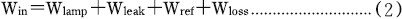 同軸導波路変換器からランプまでを負荷と考え、負荷に入るマイクロ波電力をWinとする。固体発振器でモニターされる出力電力をW1、反射電力をW2とし、発振器と負荷を接続する同軸ケーブルとコネクタの損失をk とすると、マイクロ波電力Winは次式で定義される。