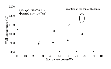 図5に水銀密度が4×1019cm-3の時のマイクロ波電力と管壁温度の関係を示す。管壁温度はいずれもマイクロ波電力の増加に伴い上昇することがわかり、高入力時にはアンテナ有りのLamp Cの方が約200°Cほど低かった。