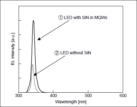 Fig.1に作製したLEDのELスペクトルを示す.①はSiNをAlInGaN井戸層中に挿入したLED,②はSiNを含まないこと以外は①と同条件で作製したLEDである.①および②の発光波長はそれぞれ341nm,342nmであった.①のピーク強度は②の約2.5倍となり,井戸層中にSiNを挿入することによりLEDの発光強度が向上することを確認した.これはSiNがAlInGaN井戸層内のIn組成不均一を増大させたことによる効果と考えられる.