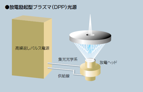 EUVを発光させるには、DPP(放電方式)とLPP(レーザー励起方式)の2つの方式があります。DPPは、放電によって直接EUVを生成できることや、装置がコンパクトで使いやすいことが大きなメリットです。もう一方のLPPは、クリーンでエネルギー効率が高く、パワーアップしやすいことが特色です。