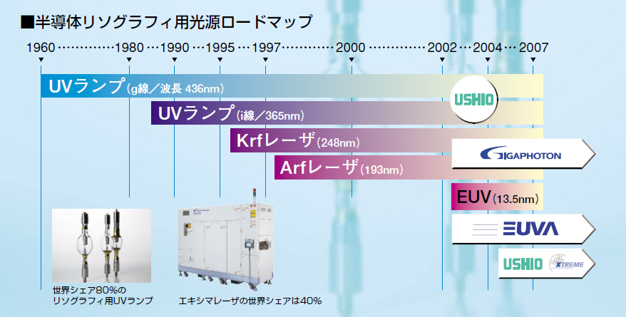 ウシオは、ICが登場する1960年代から、半導体露光用光源の開発を手掛け、露光装置メーカーと連携しながら、g線ランプ、i線ランプ、KrFレーザー、ArFレーザーなど、数々の新光源を開発してきました。現在では、露光用光源のすべてを揃える世界で唯一の光源メーカーとなり、この分野で85%の世界シェアを獲得しています。